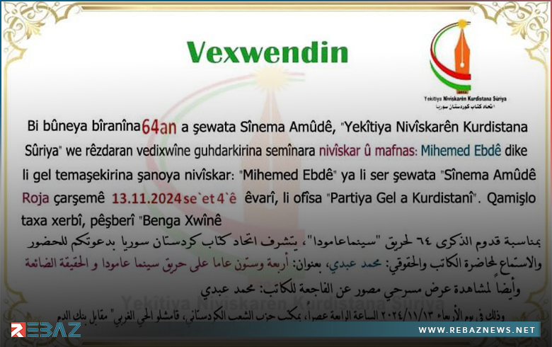 بمناسبة الذكرى الـ64 لحريق سينما عامودا، دعا اتحاد كتاب كوردستان سوريا لحضور محاضرة بعنوان "أربعة وستون عاما على حريق سينما عامودا والحقيقة الضائعة"، يلقيها الكاتب والحقوقي محمد عبدي.
