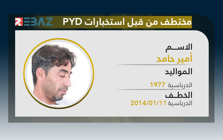 واختطف الناشط أمير حامد يوم الـ 11 من كانون الثاني 2014, على يد مجموعة مسلحة تابعة لاستخبارات حزب الاتحاد الديمقراطي PYD من منزله في الدرباسية، ولا يزال مصيره مجهولا حتى ساعة اعداد هذا التقرير.