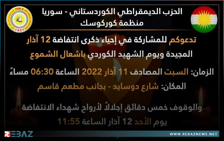 تدعوكم للمشاركة في إحياء ذكرى انتفاضة 12 آذار المجيدة ويوم الشهيد الكوردي بإشعال الشموع