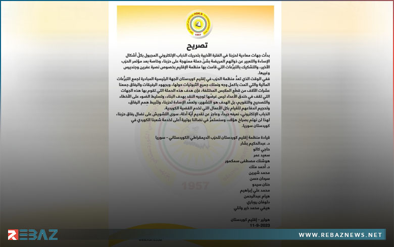 قيادة منظمة إقليم كوردستان للحزب الديمقراطي الكوردستاني - سوريا تصدر بياناً حول الحملة الممنهجة ضد الحزب