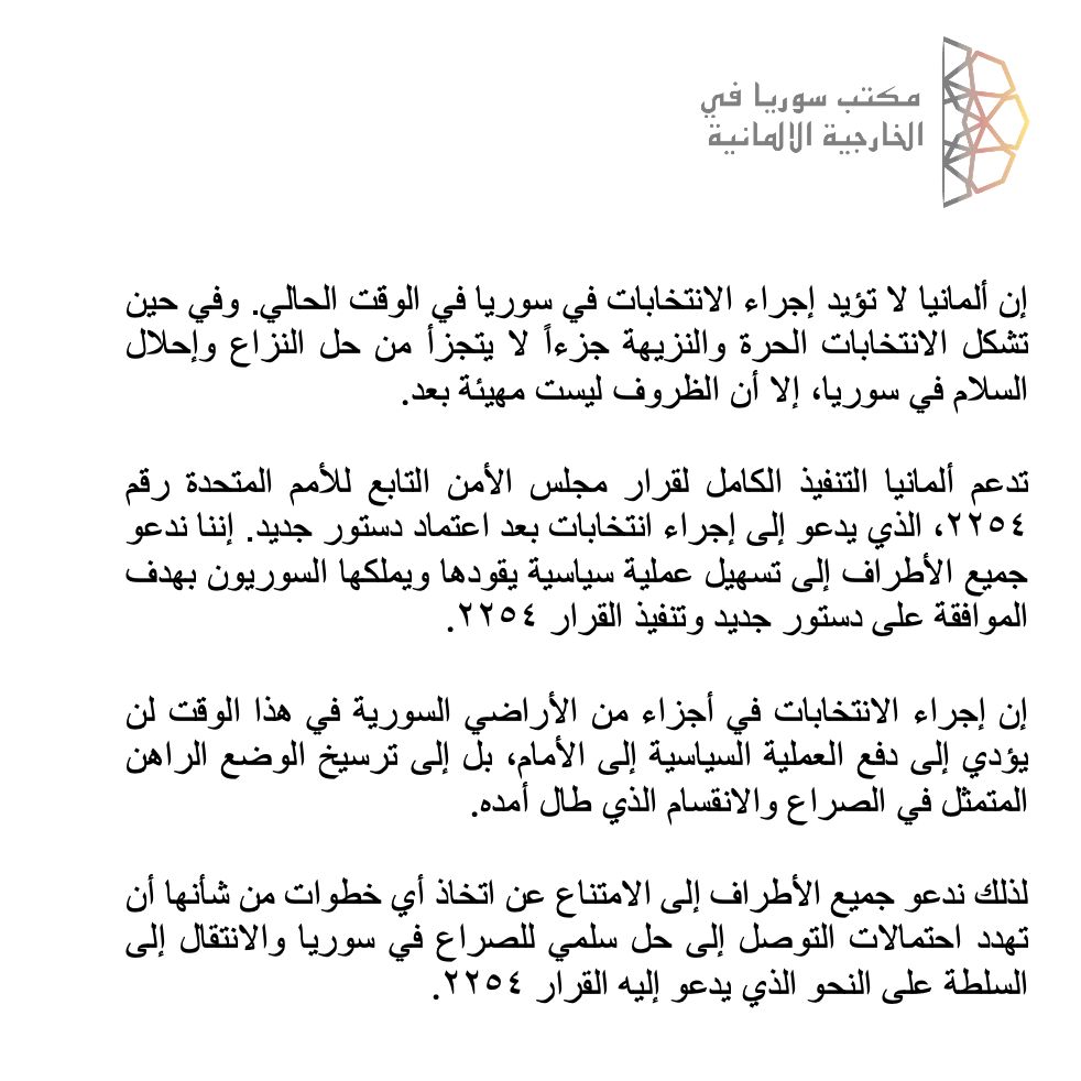 في تغريدة على حسابه في منصة X, قال المبعوث الألماني إلى سوريا, ستيفان شنيك أن ألمانيا لا تؤيد إجراء الانتخابات في سوريا في الوقت الحالي وفي حين تشكل الانتخابات الحرة والنزيهة جزءاً لا يتجزا من حل النزاع وإحلال السلام في سوريا إلا أن الظروف ليست مهيئة بعد.
