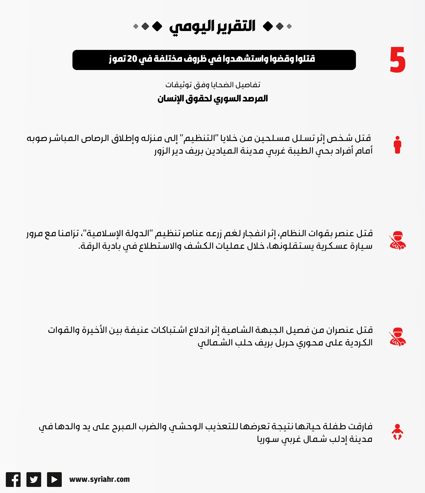 أصدر المرصد السوري لحقوق الإنسان فجر اليوم، الأحد 21 تموز، تقريراً وثّق فيه مقتل واستشهاد وفقدان 5 أشخاص لحياتهم في سوريا أمس، السبت.