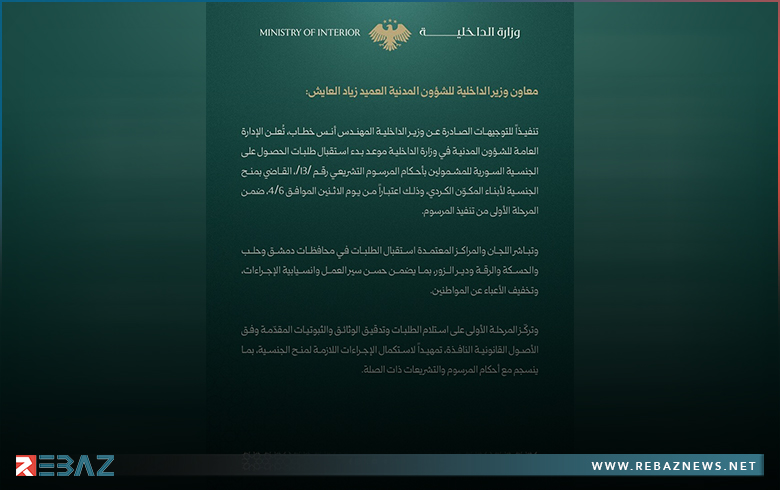 قال معاون وزير الداخلية السوري للشؤون المدنية العميد زياد العايش: "تنفيذا للتوجيهات الصادرة عن وزير الداخلية أنس خطاب تعلن الإدارة العامة للشؤون المدنية في وزارة الداخلية موعد بدء استقبال طلبات الحصول على الجنسية السورية للمشمولين بأحكام المرسوم التشريعي رقم 13 القاضي بمنح الجنسية لأبناء الشعب الكوردي وذلك بدءا من يوم الإثنين الموافق 6 نيسان الجاري ضمن المرحلة الأولى من تنفيذ أحكام المرسوم".