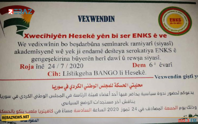 دعت محليتي الحسكة للمجلس الوطني الكوردي في سوريا ENKS دعوة لحضور ندوة سياسية يوم الجمعة 24 تموز 2020، في الحسكة فيمايلي نص الدعوة: